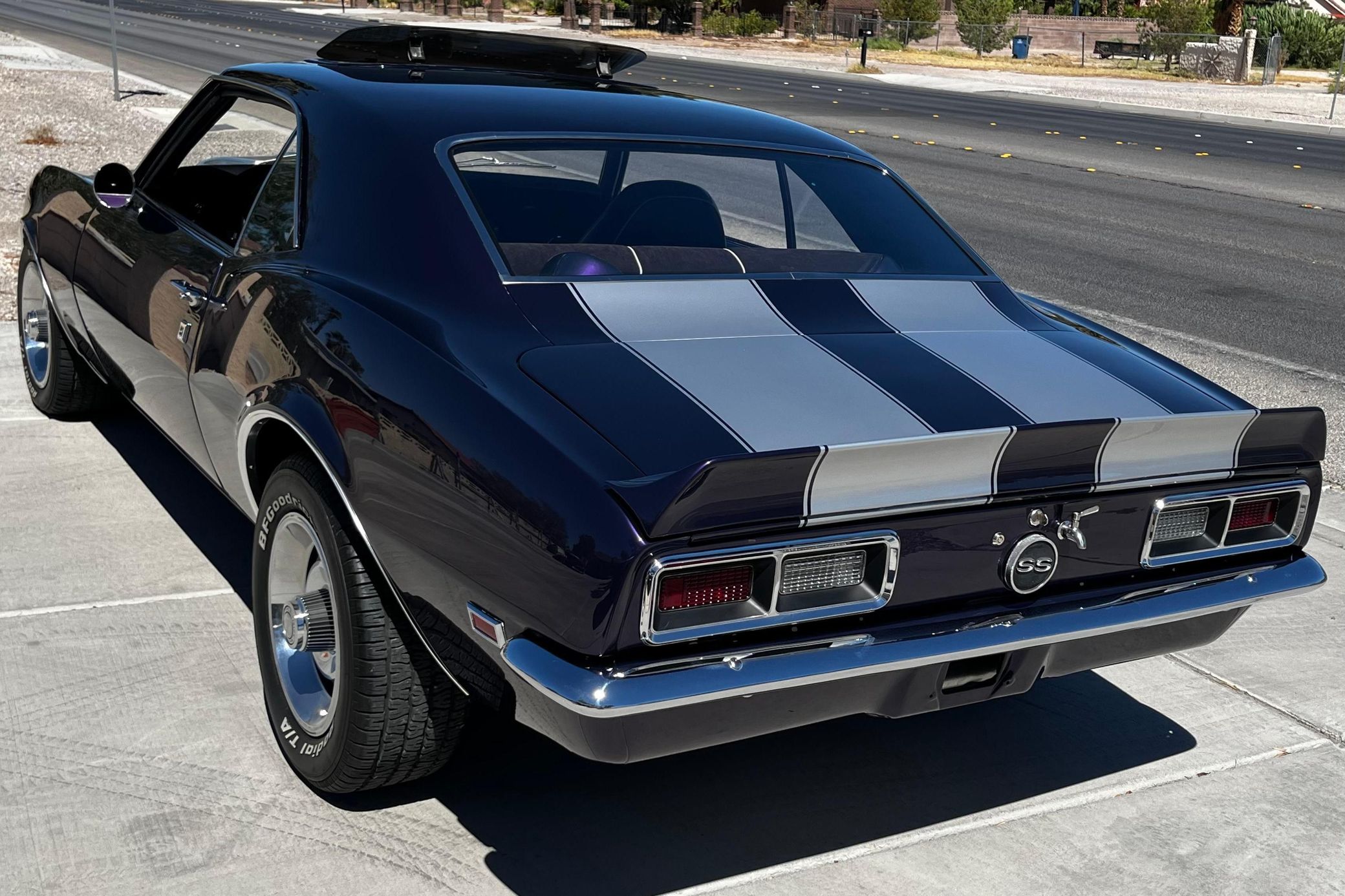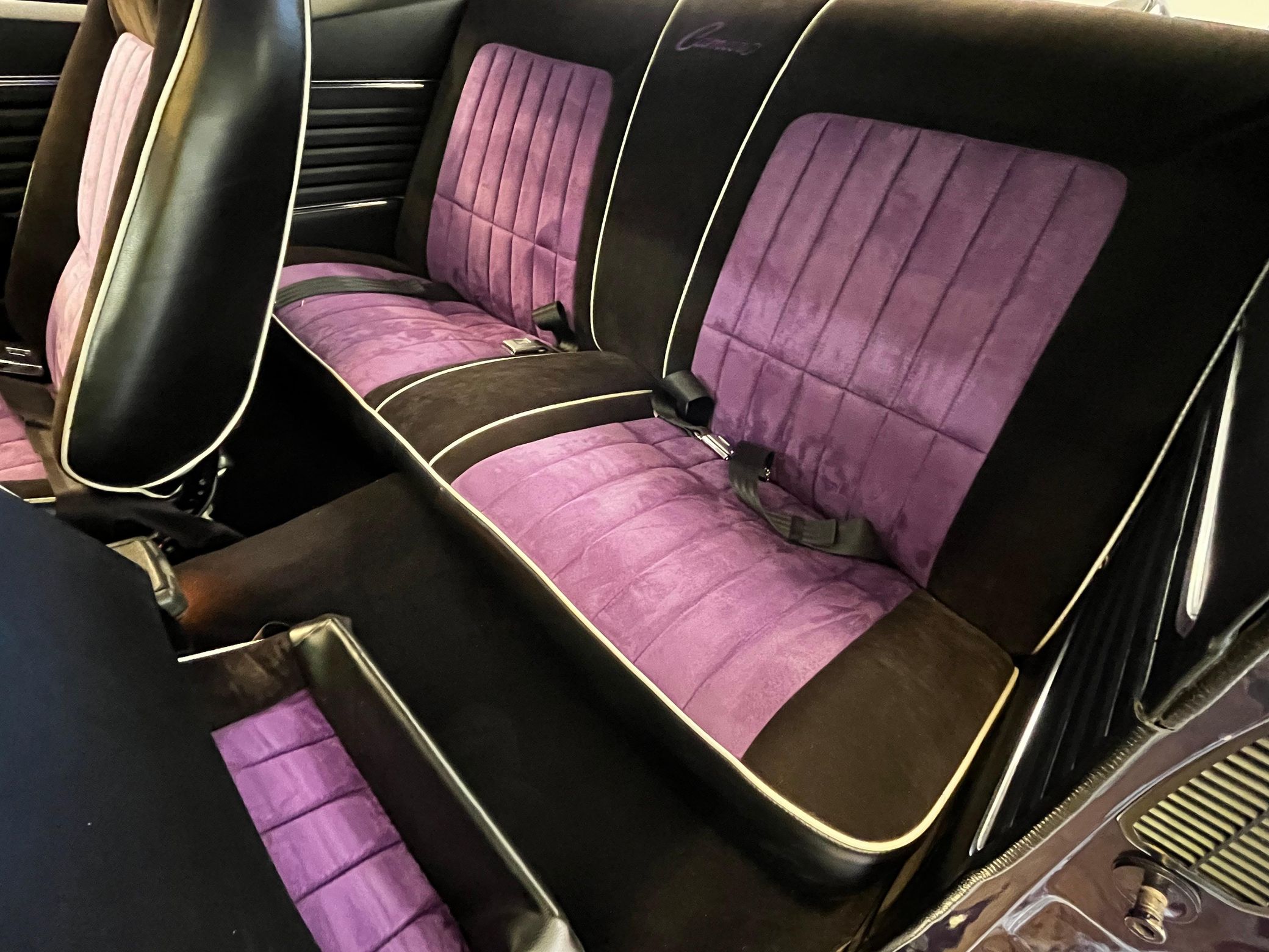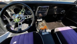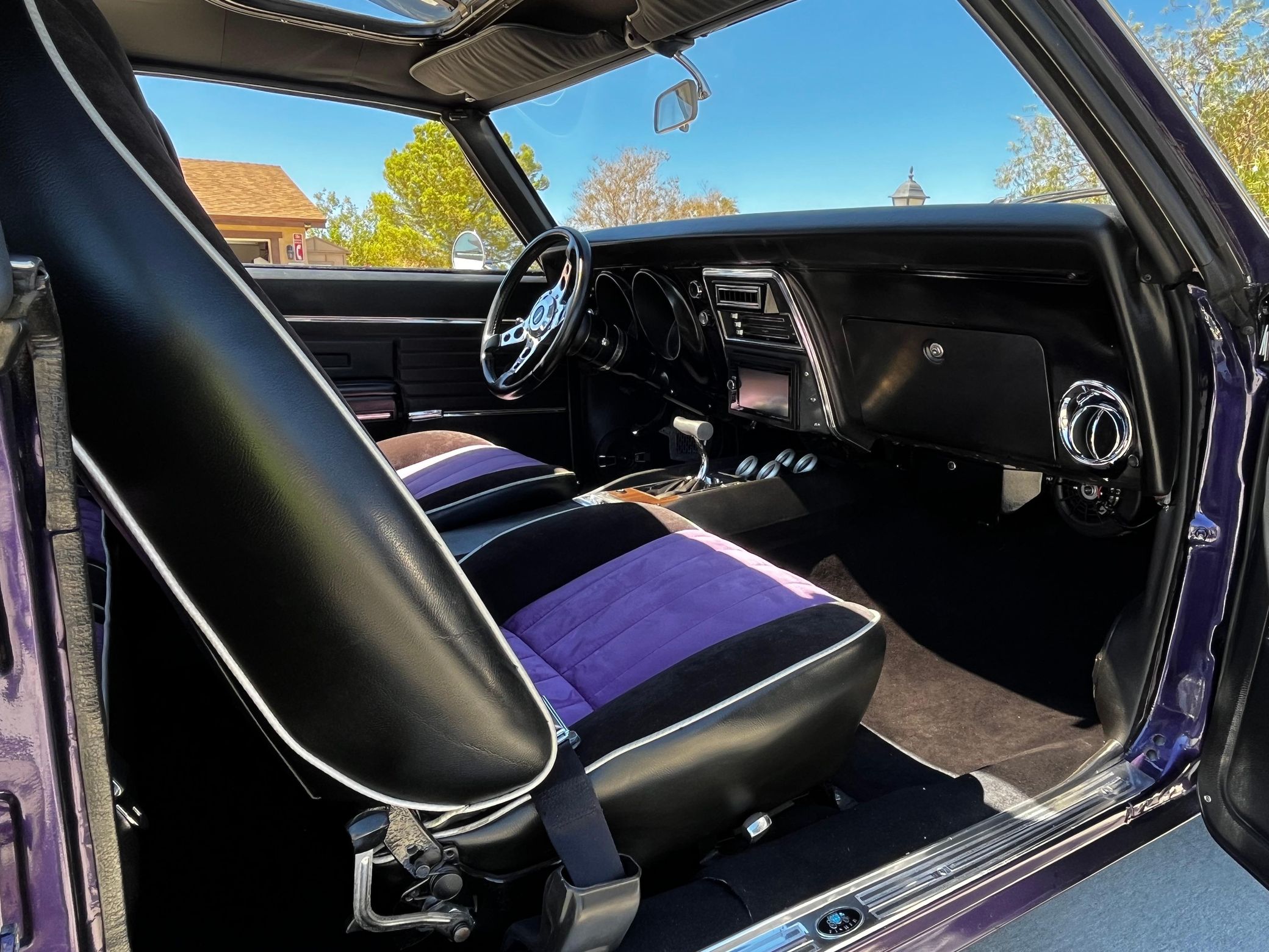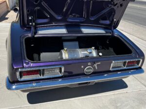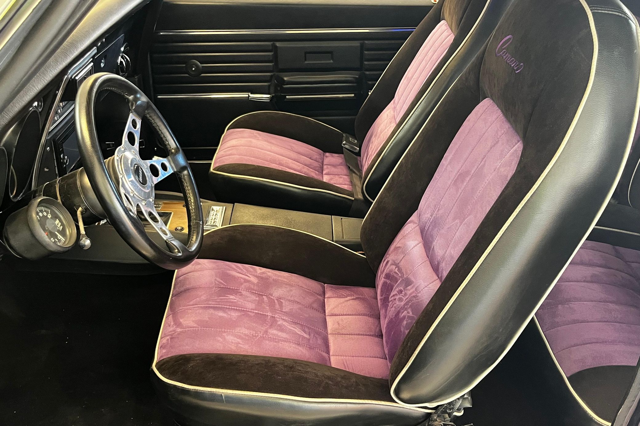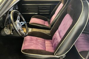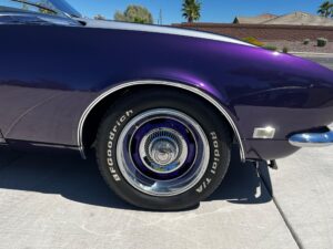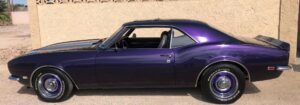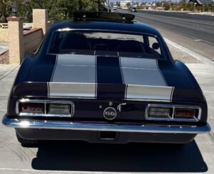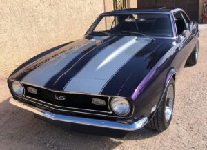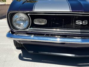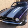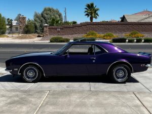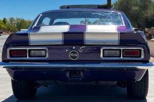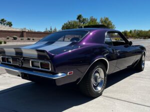 This 1968 Chevrolet Camaro Coupe is finished in a custom purple and silver two-tone exterior over a black and purple interior. It is reported to have undergone a body-off restoration and remains in excellent driving condition.