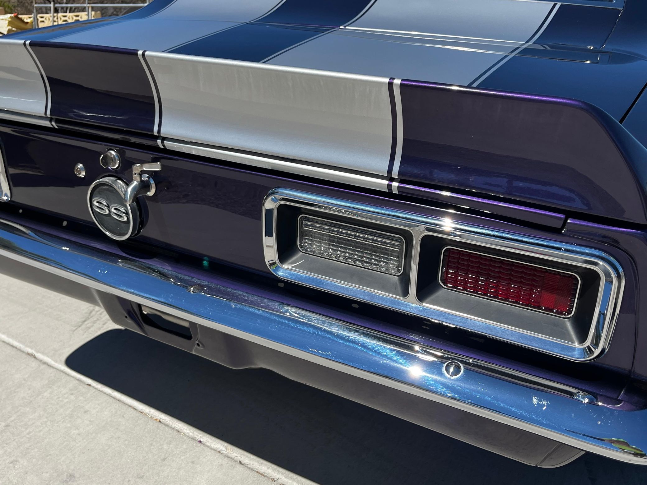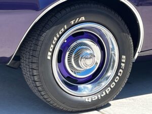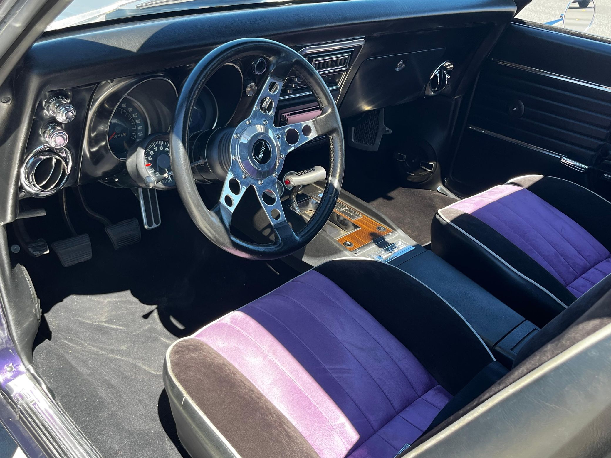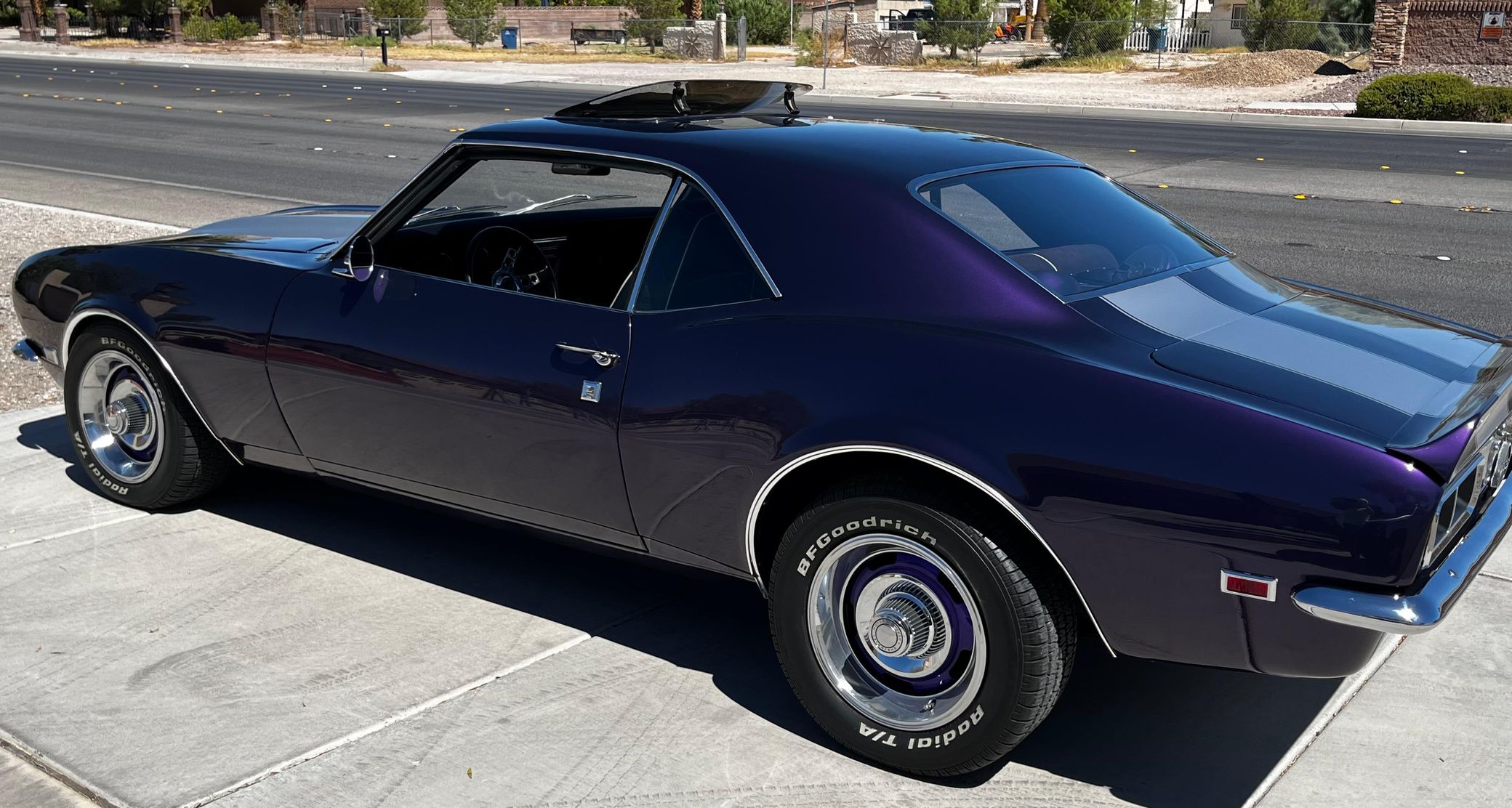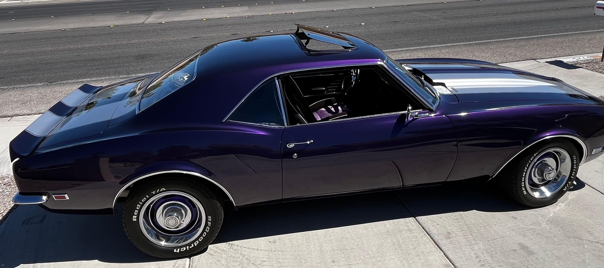 This 1968 Chevrolet Camaro Coupe is finished in a custom purple and silver two-tone exterior over a black and purple interior. It is reported to have undergone a body-off restoration and remains in excellent driving condition.