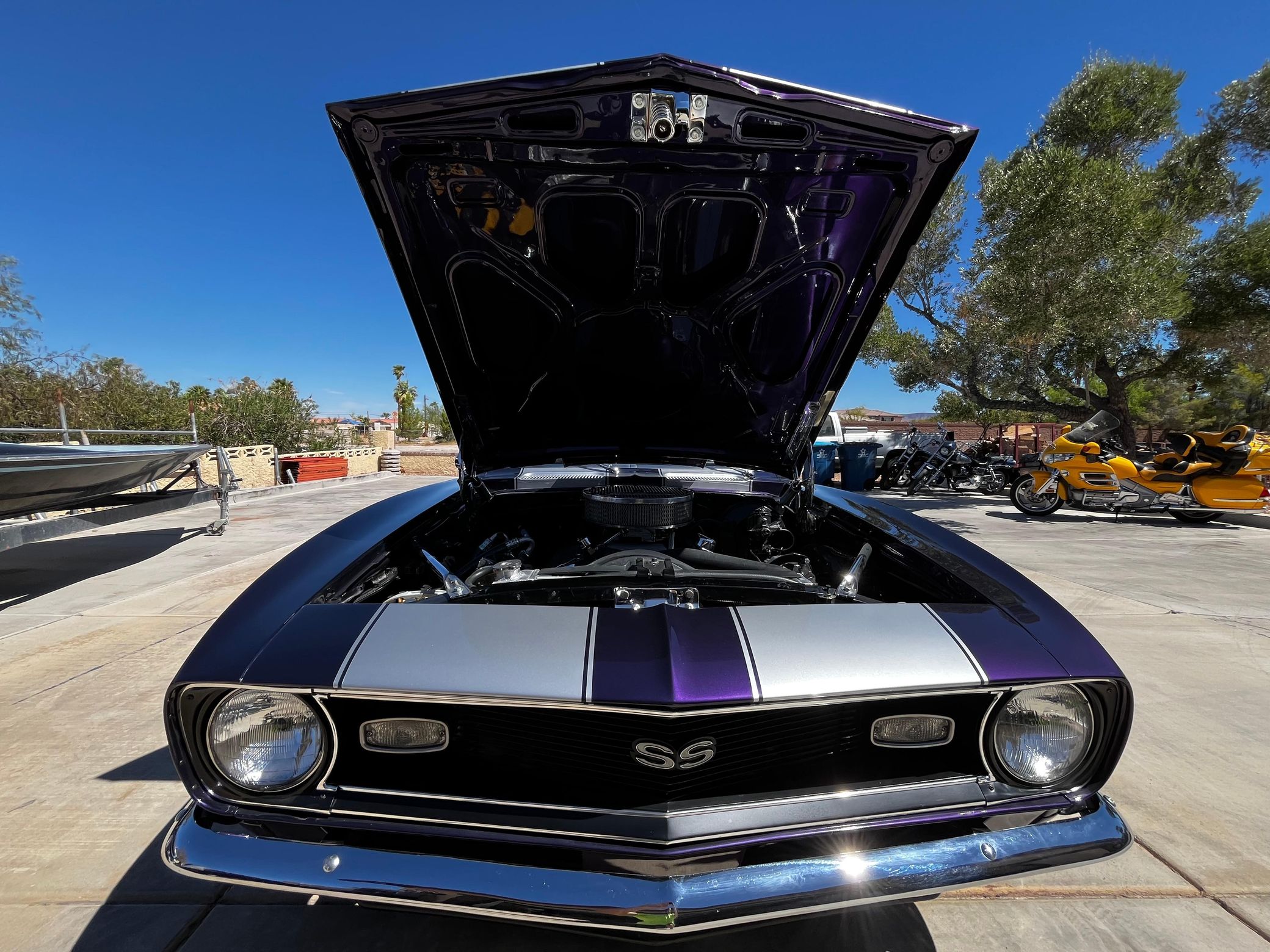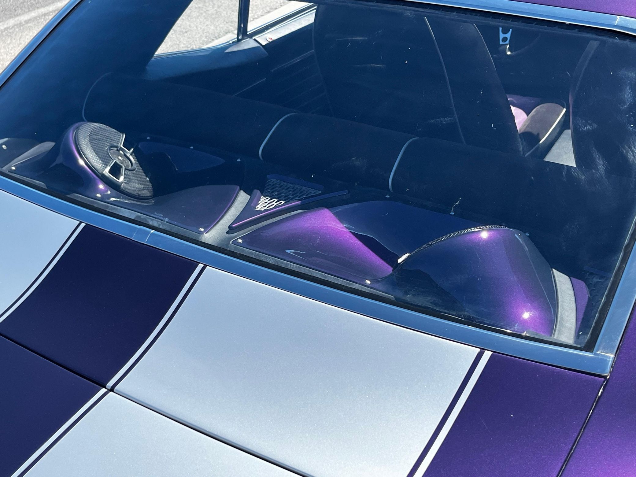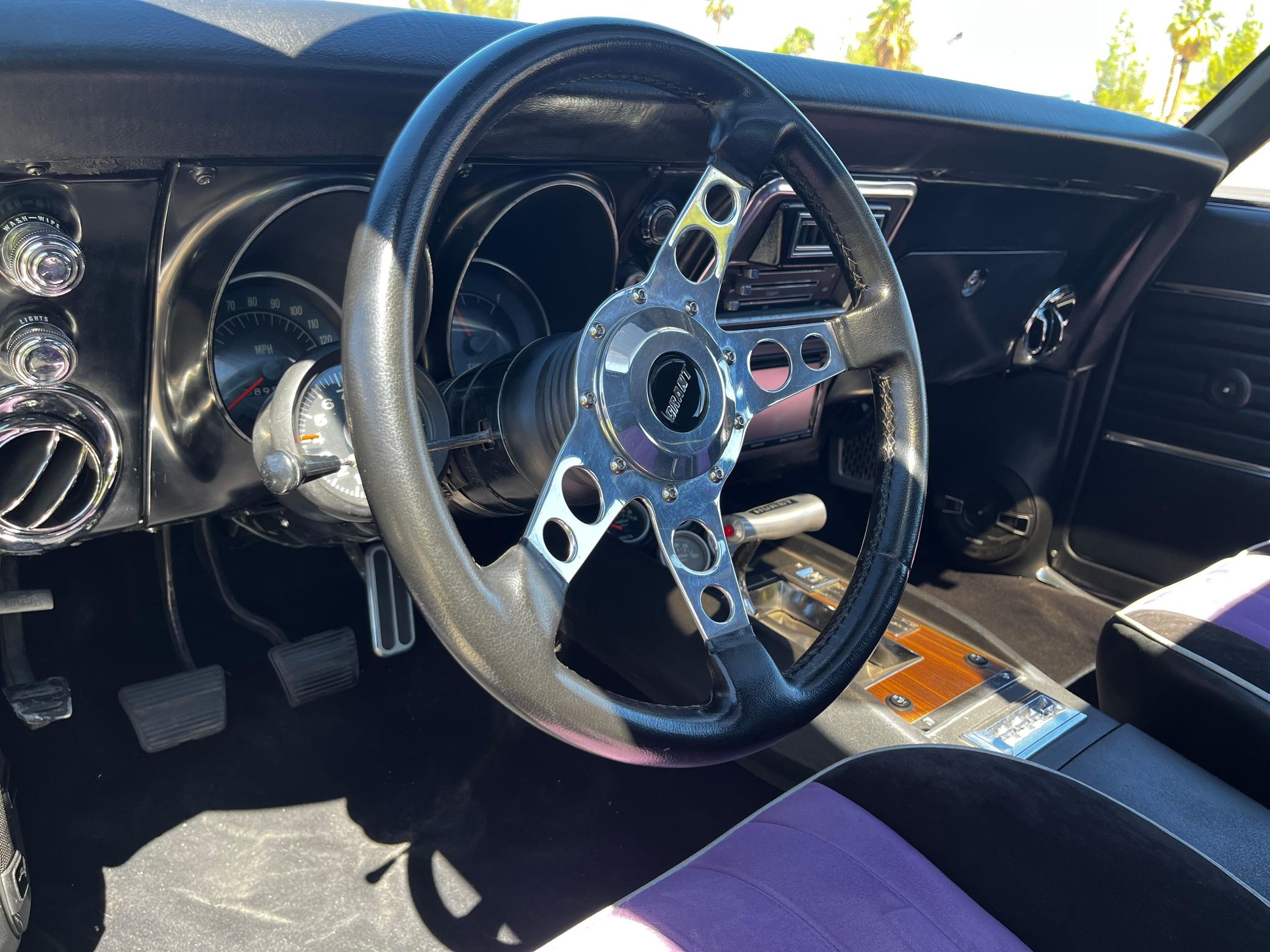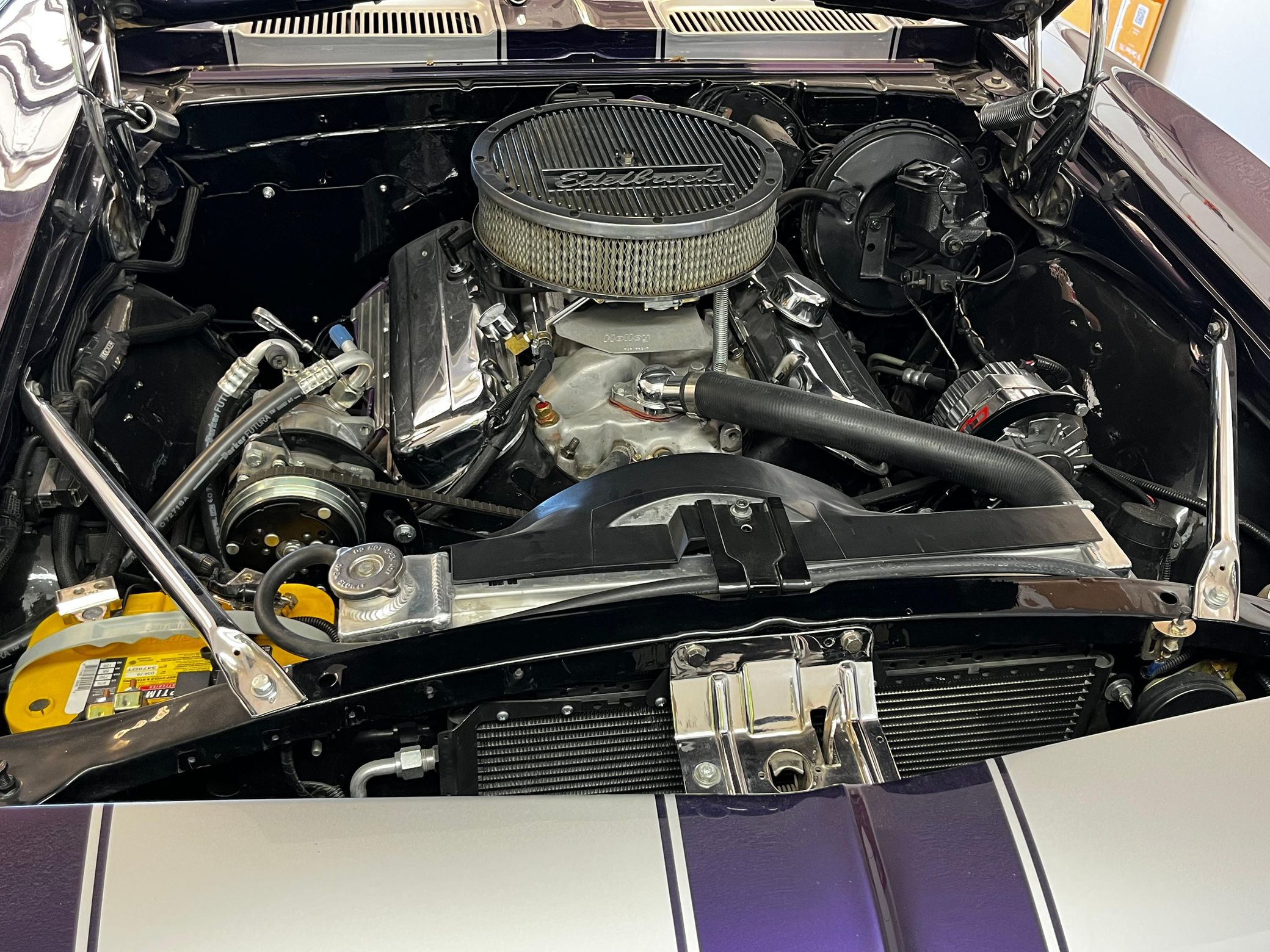 This 1968 Chevrolet Camaro Coupe is finished in a custom purple and silver two-tone exterior over a black and purple interior. It is reported to have undergone a body-off restoration and remains in excellent driving condition.