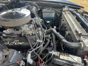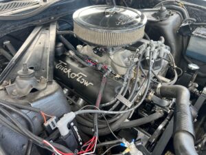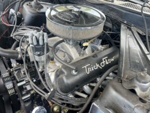 The car features a comprehensively rebuilt 408-cubic-inch V8, completed in December 2021, according to documentation included with the sale. The engine build includes Trick Flow Specialties Twisted Edge cylinder heads, Holley Sniper II electronic fuel injection, and an MSD electronic ignition system, blending classic muscle with modern reliability and tuning precision.