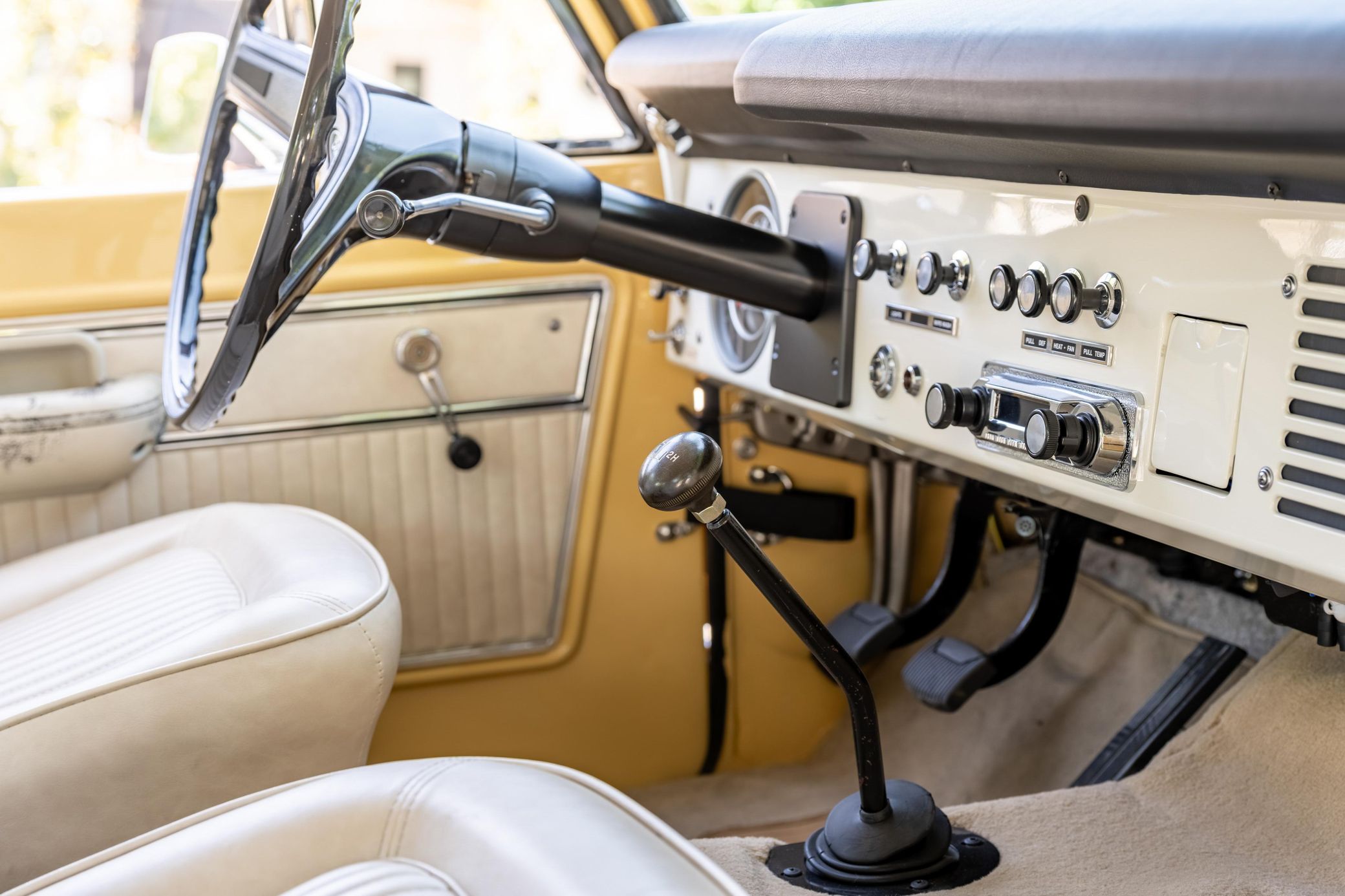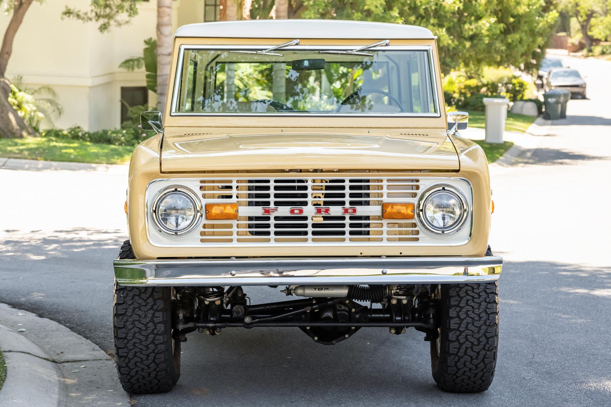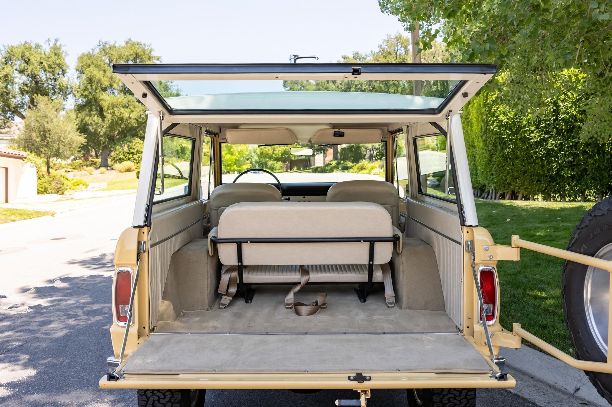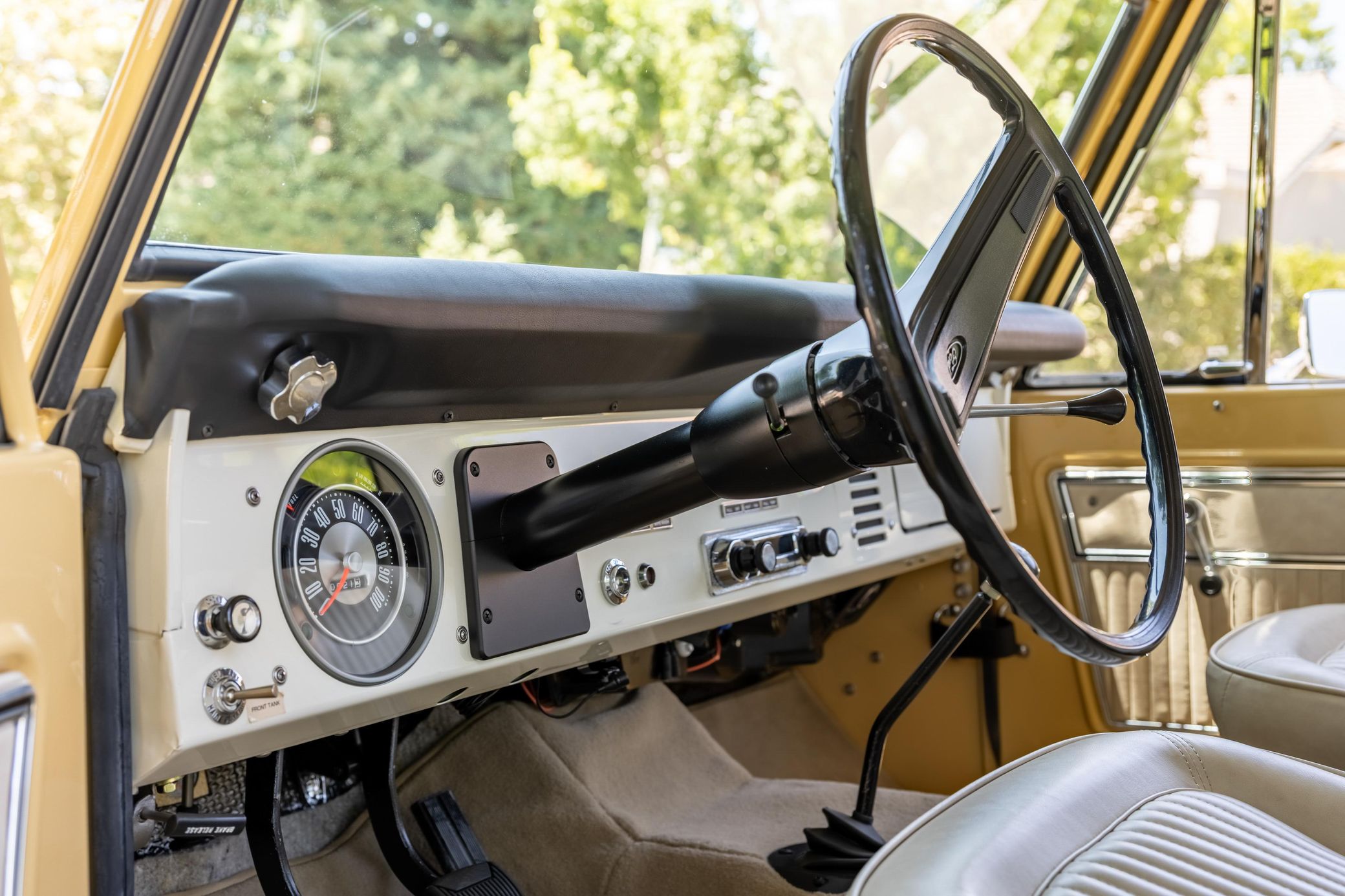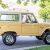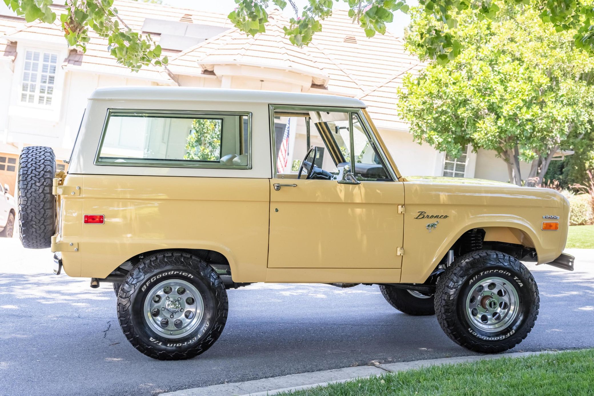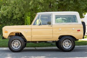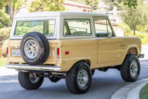 This 1975 Ford Bronco is a beautifully restored example of Ford’s original off-road icon, finished in Vineyard Gold with a white removable hardtop and Parchment Rosette interior. It underwent a frame-off restoration less than 1,000 miles ago.