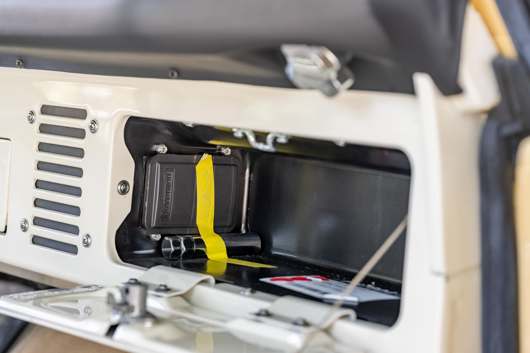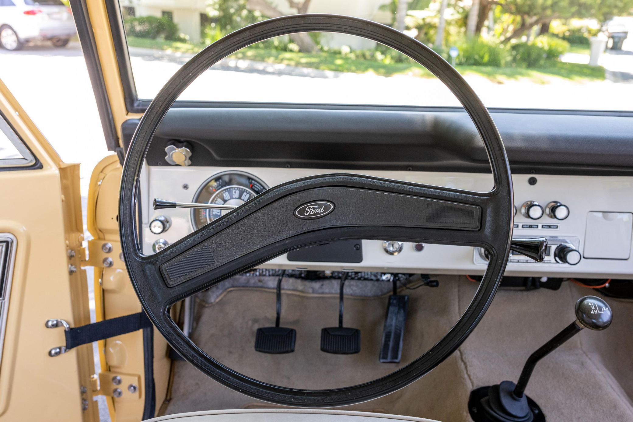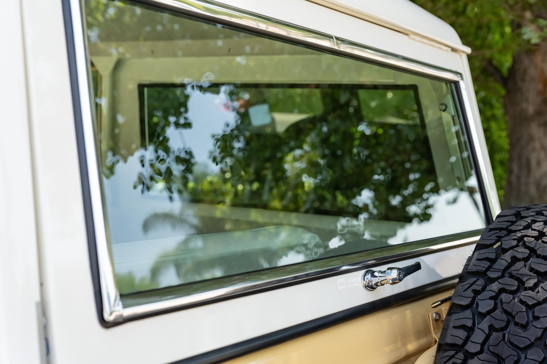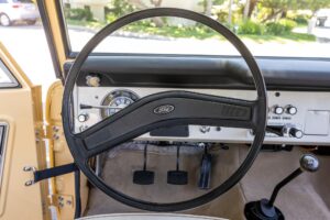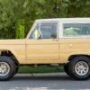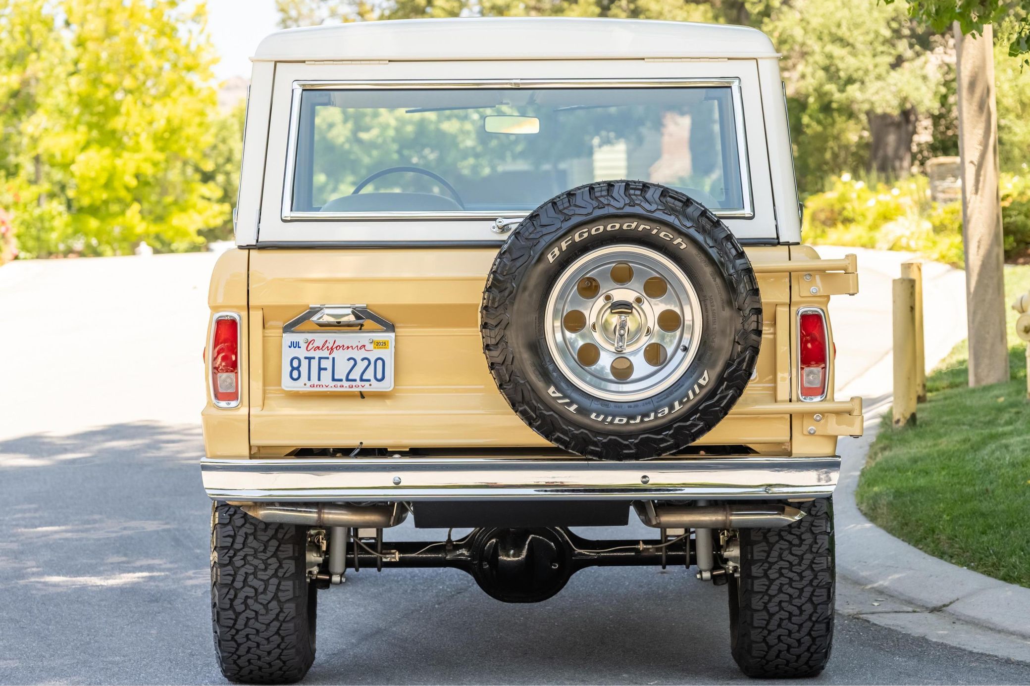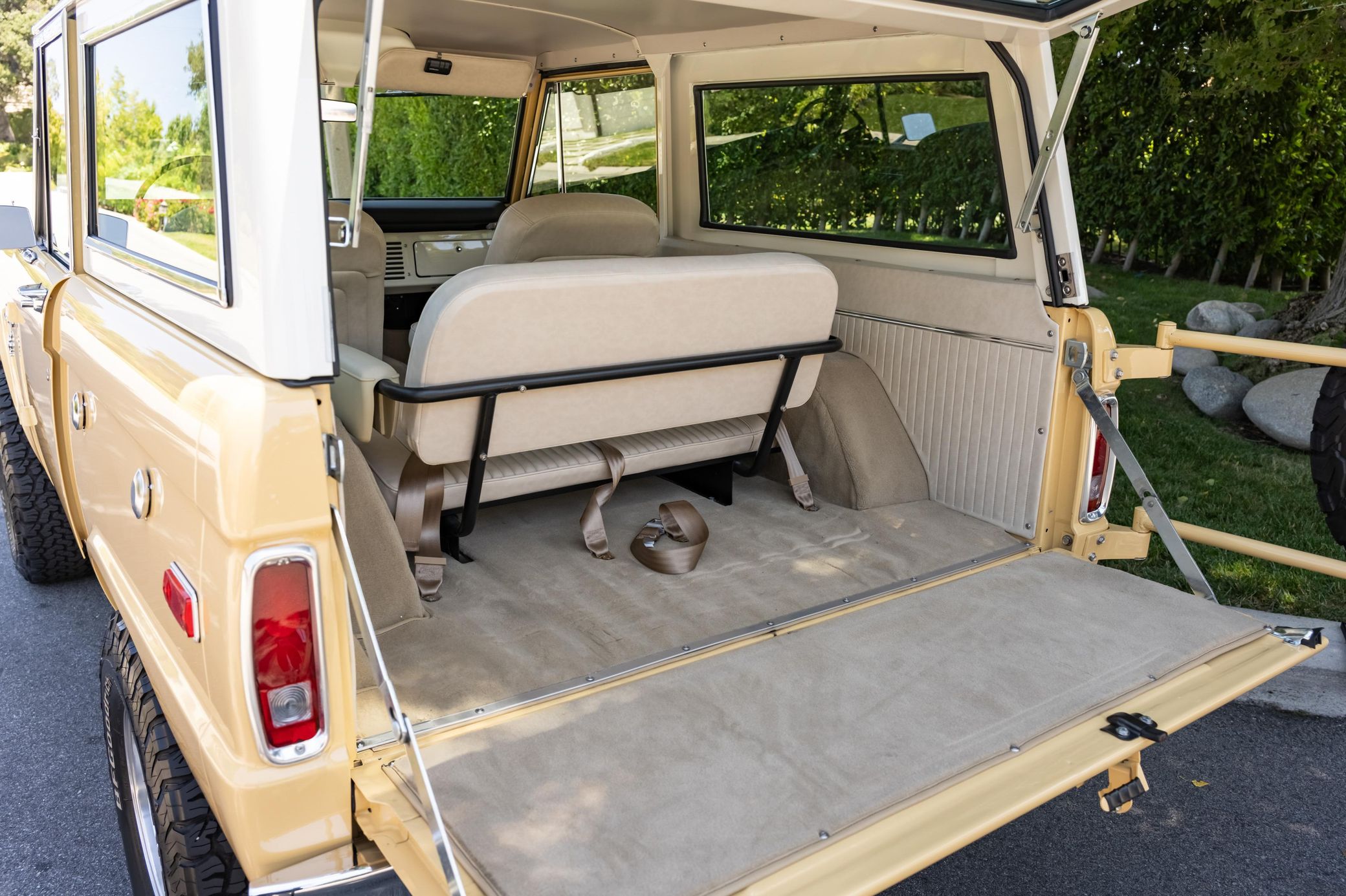 This 1975 Ford Bronco is a beautifully restored example of Ford’s original off-road icon, finished in Vineyard Gold with a white removable hardtop and Parchment Rosette interior. It underwent a frame-off restoration less than 1,000 miles ago.