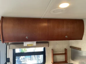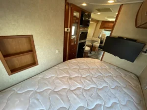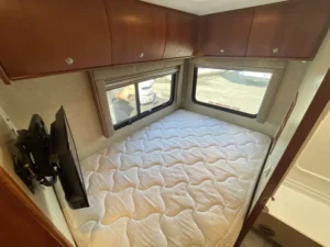 Rear Corner Queen Bed with Overhead Cabinets and Wardrobe Storage