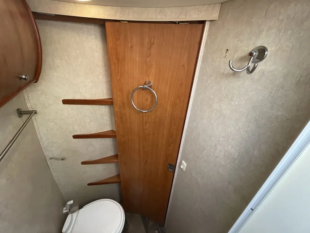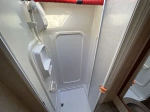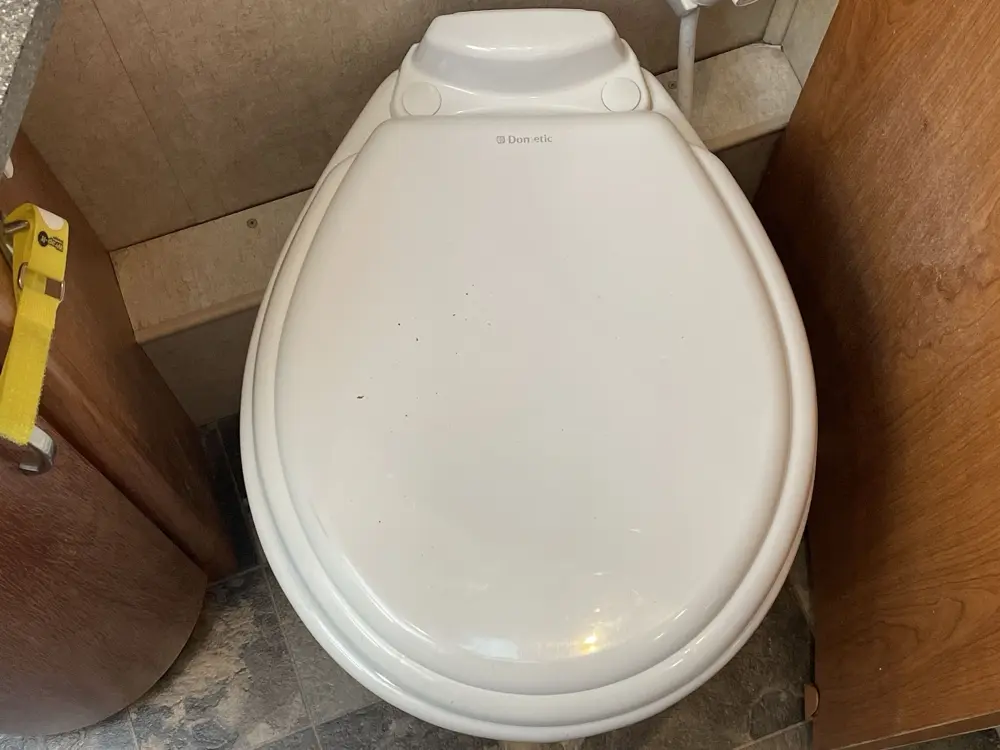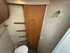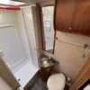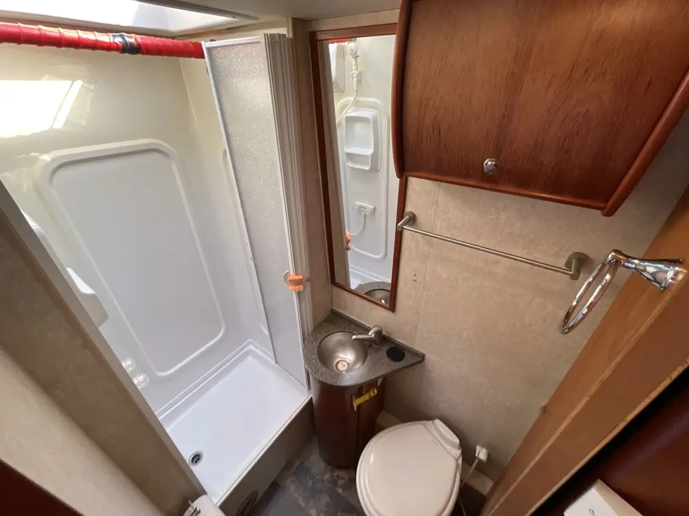 Full Rear Corner Bathroom with Enclosed Shower, Toilet, Vanity, and Storage