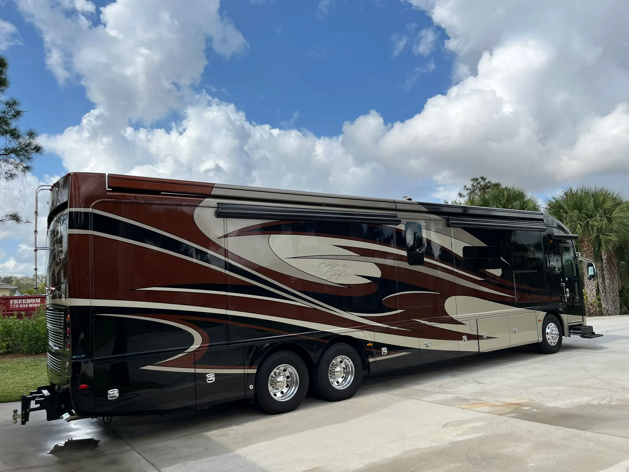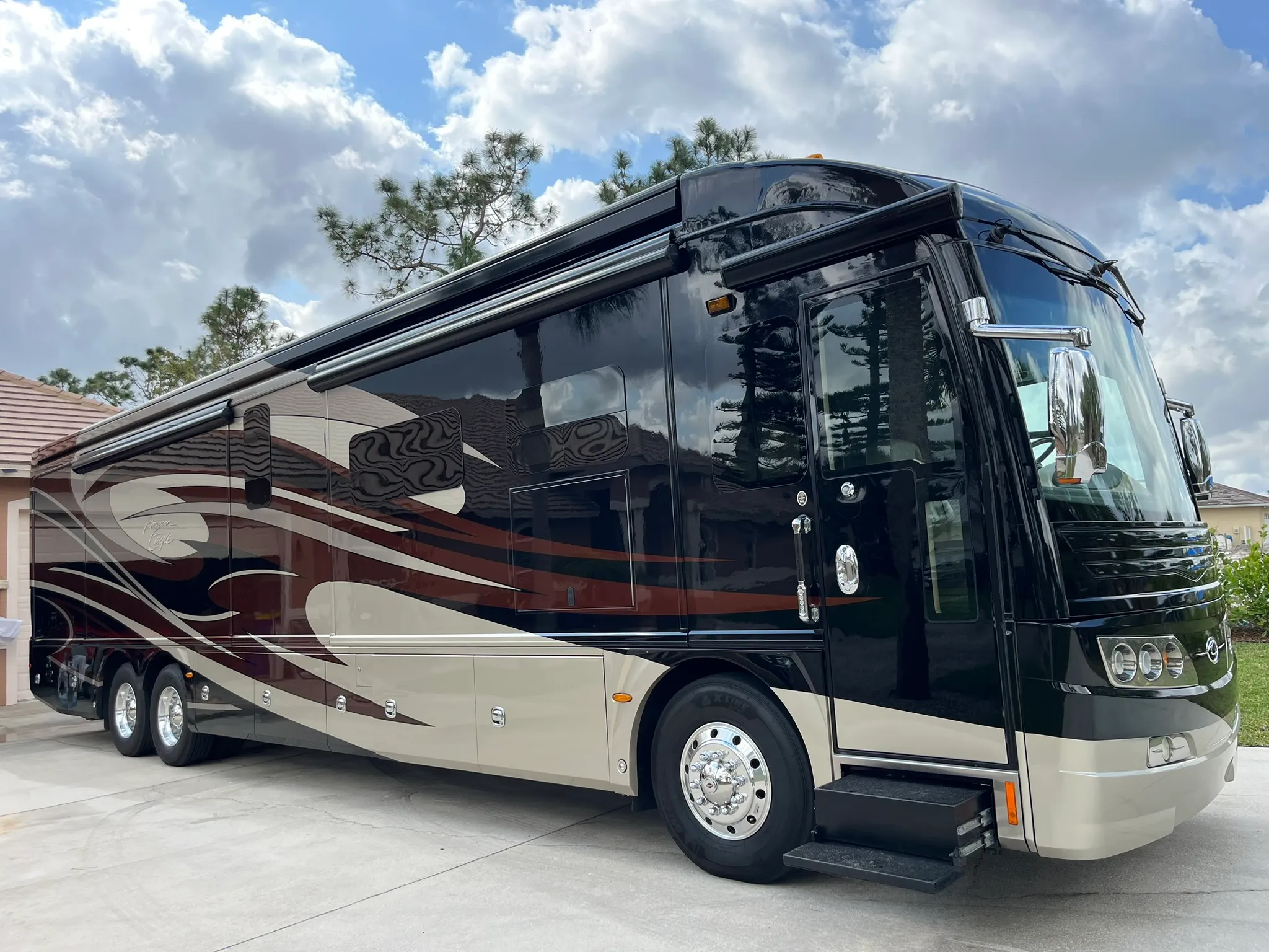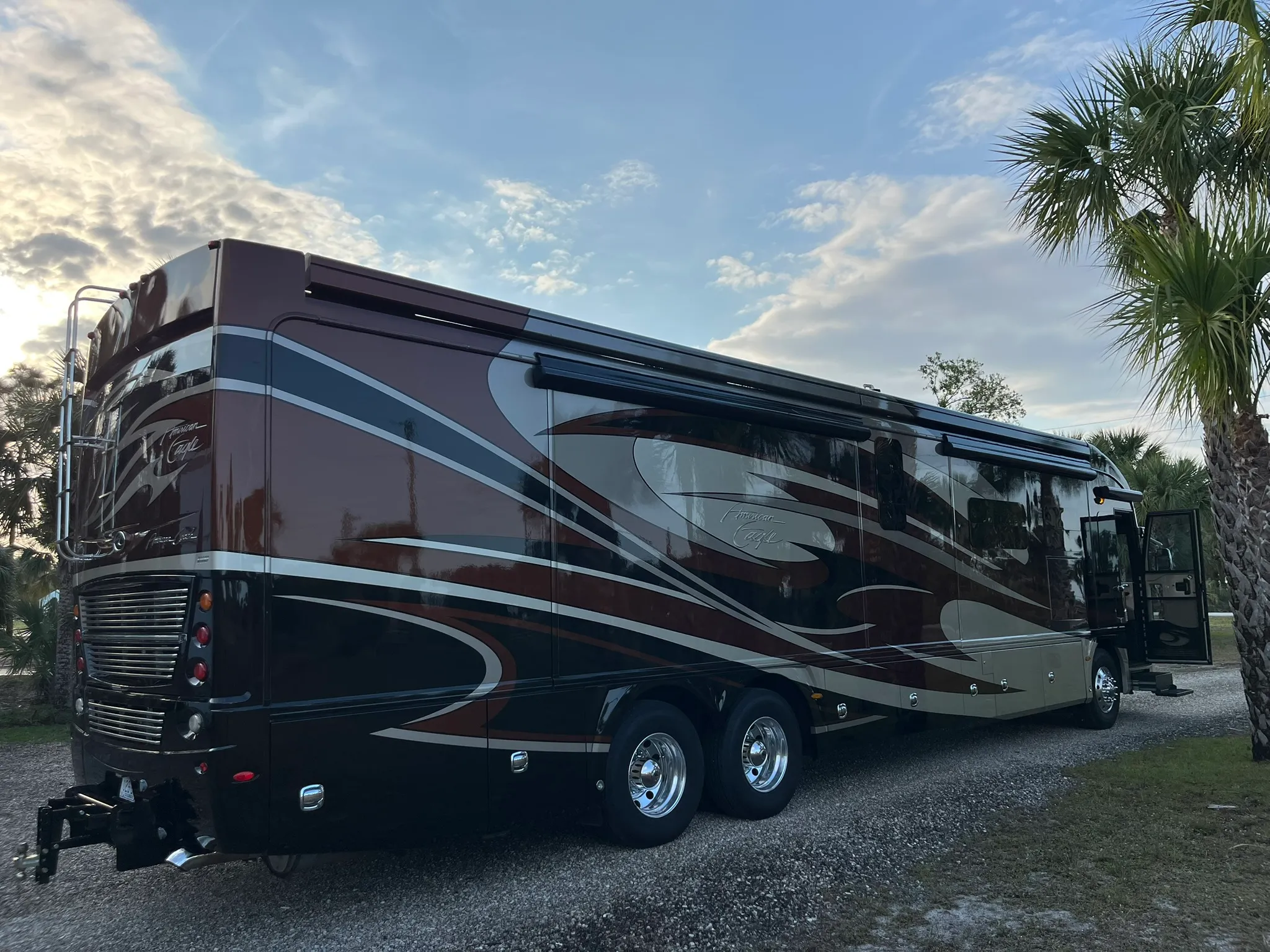 Finished in Black and Metallic Copper with multi-tone graphics, this triple-slide motorcoach combines commanding road presence with residential-level refinement. Inside, the Eagle features a spacious floor plan with heated tile floors, Ultraleather furnishings, hydronic heating, and high-end amenities including four flat-screen TVs, a Bose sound system, and a king bedroom suite with a private bath.