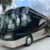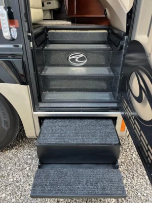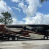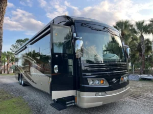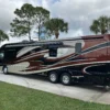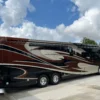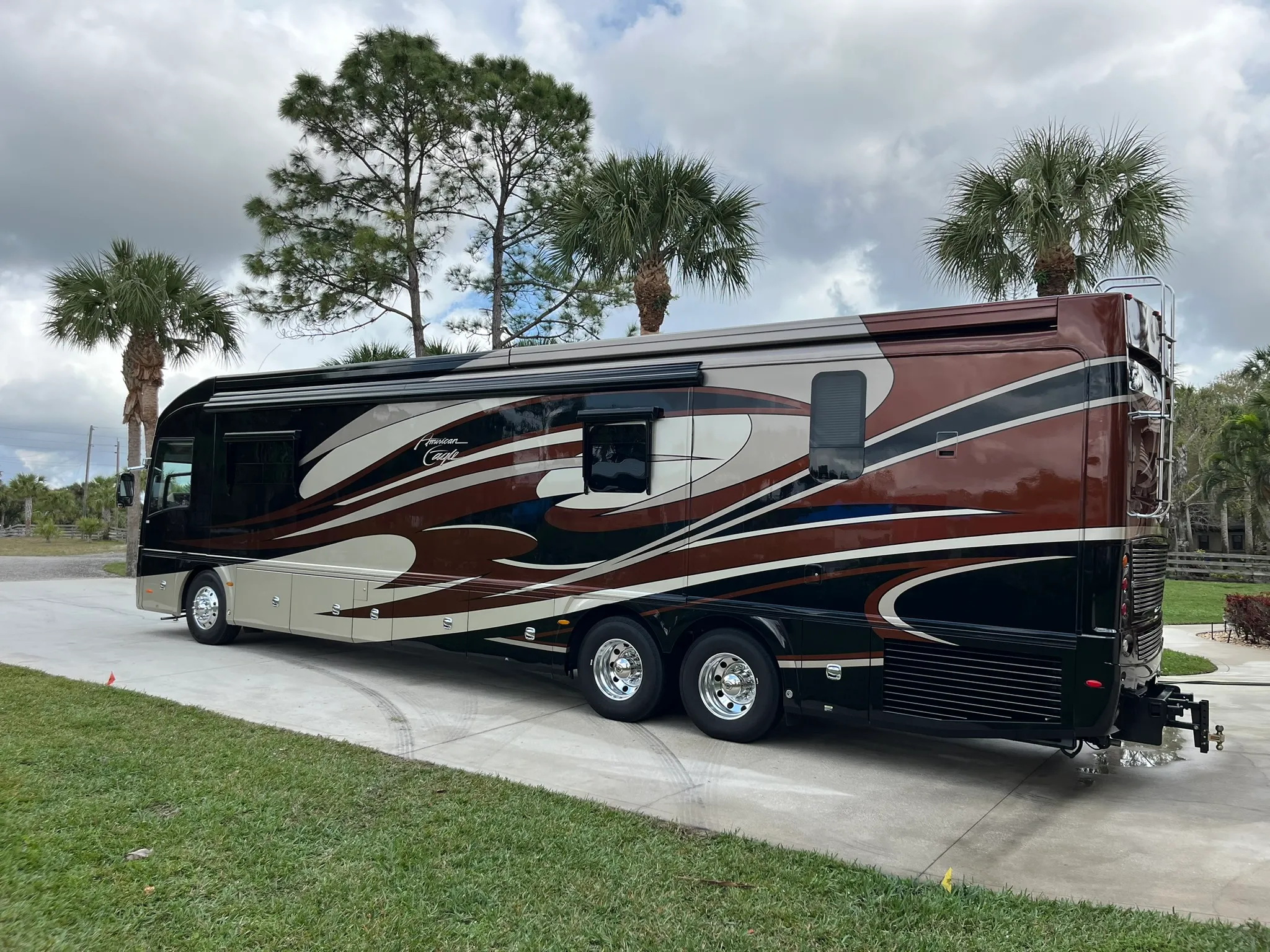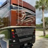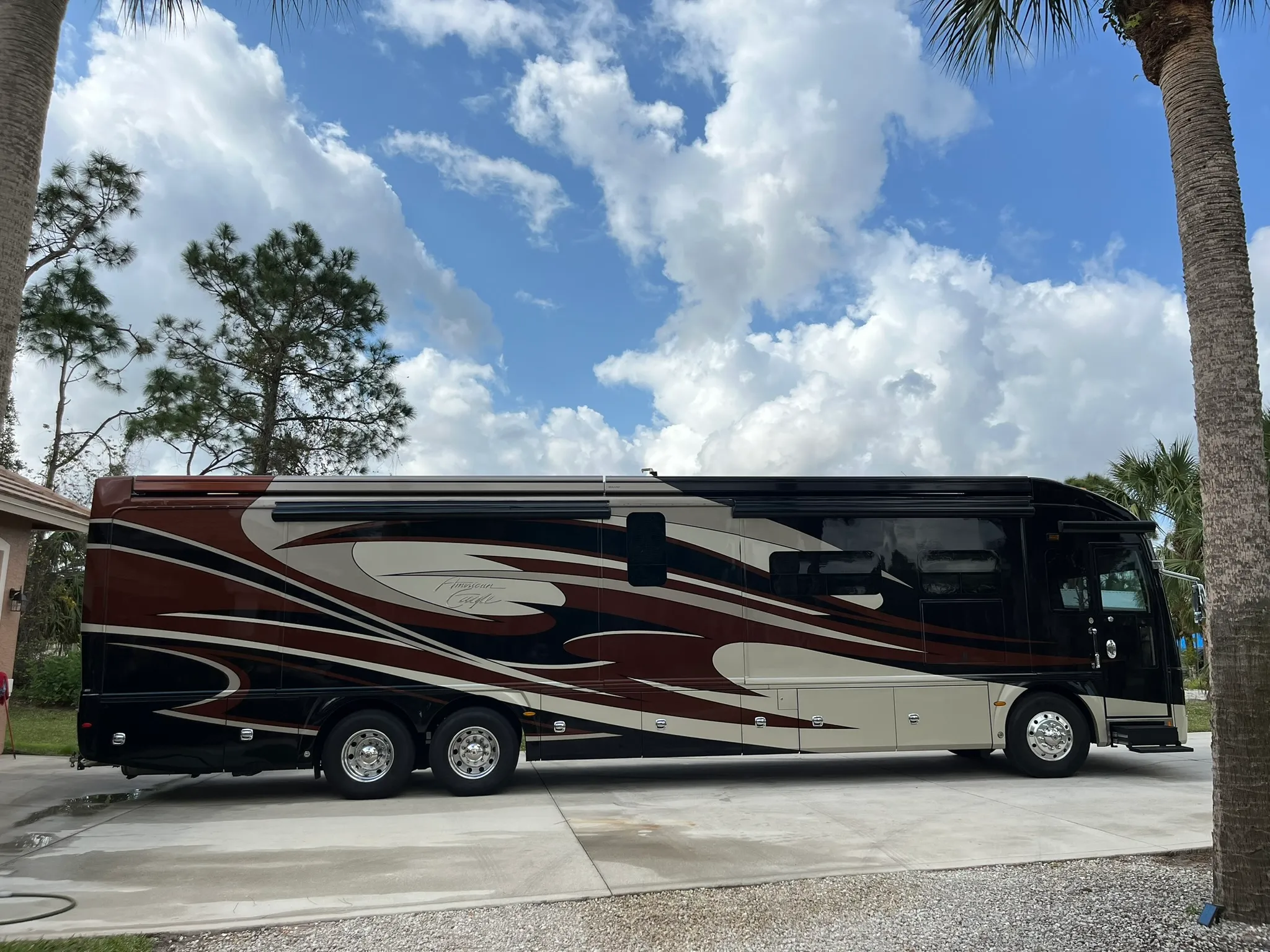 Finished in Black and Metallic Copper with multi-tone graphics, this triple-slide motorcoach combines commanding road presence with residential-level refinement. Inside, the Eagle features a spacious floor plan with heated tile floors, Ultraleather furnishings, hydronic heating, and high-end amenities including four flat-screen TVs, a Bose sound system, and a king bedroom suite with a private bath.