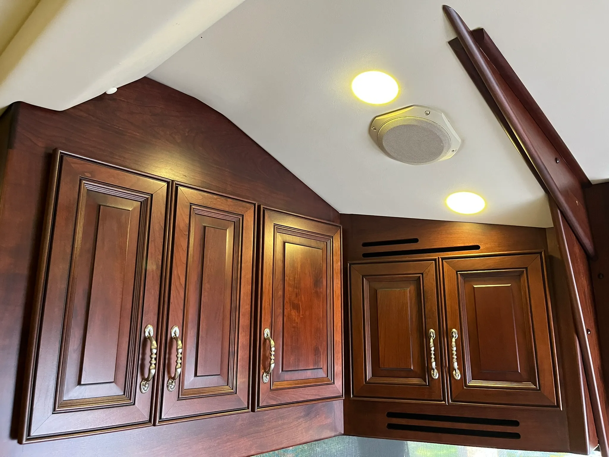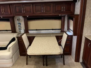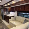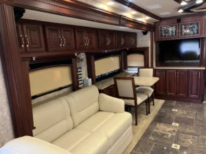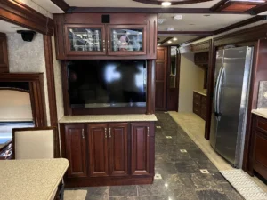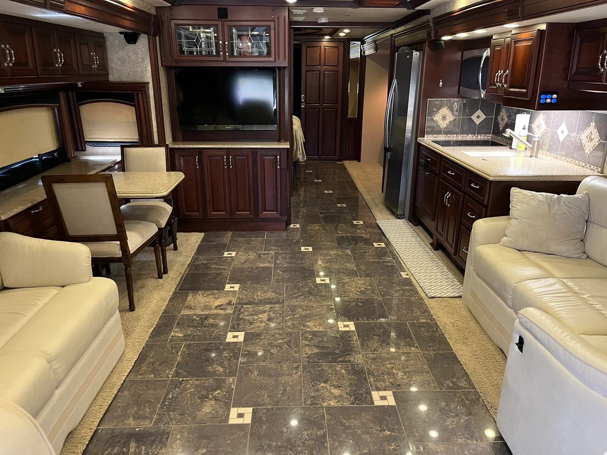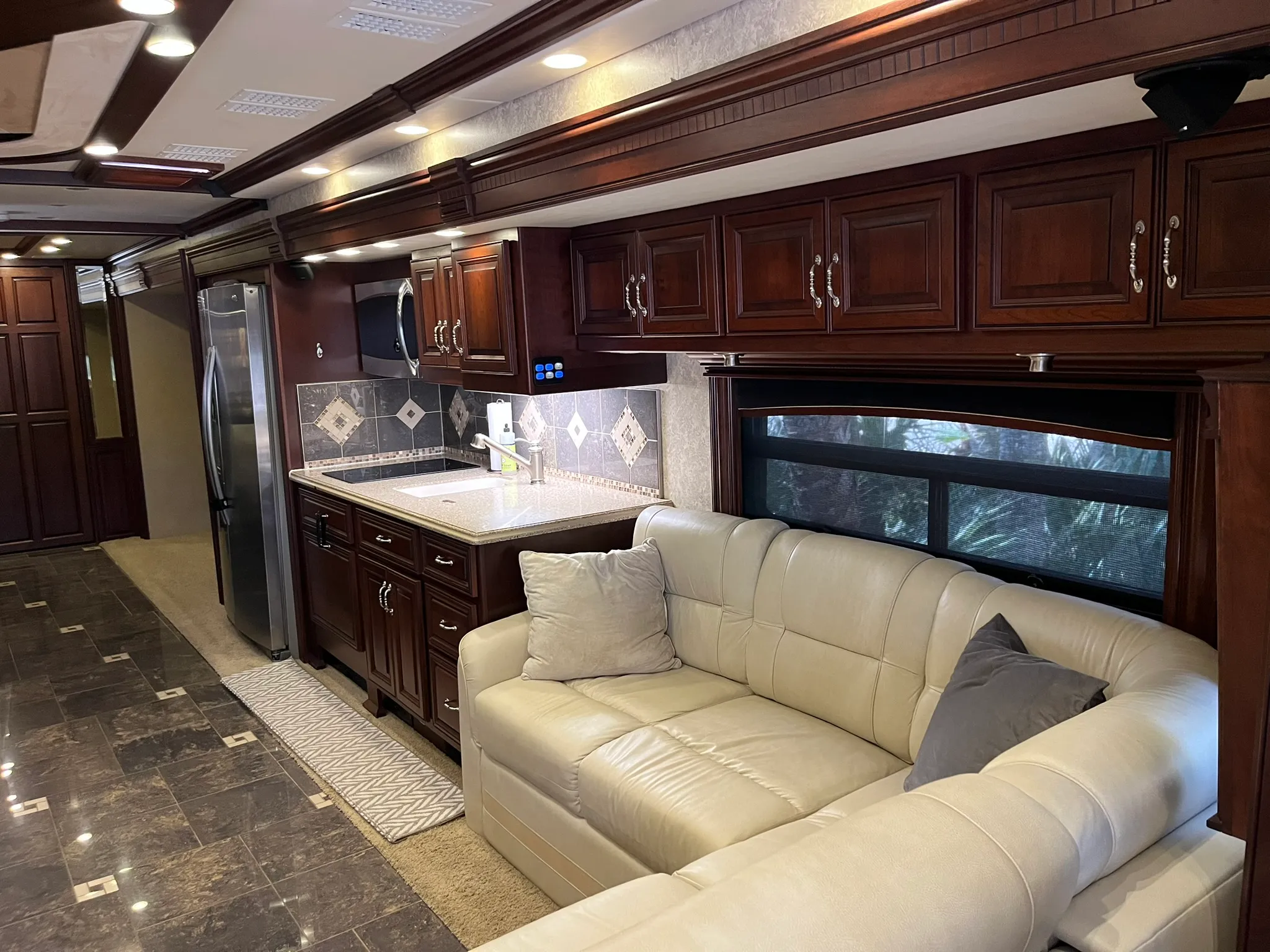 Step inside the 45T and experience a beautifully finished cabin with an 84-inch ceiling height, heated tile flooring, and handcrafted cherry wood cabinetry. The layout combines open living comfort with practical luxury for long-term touring.