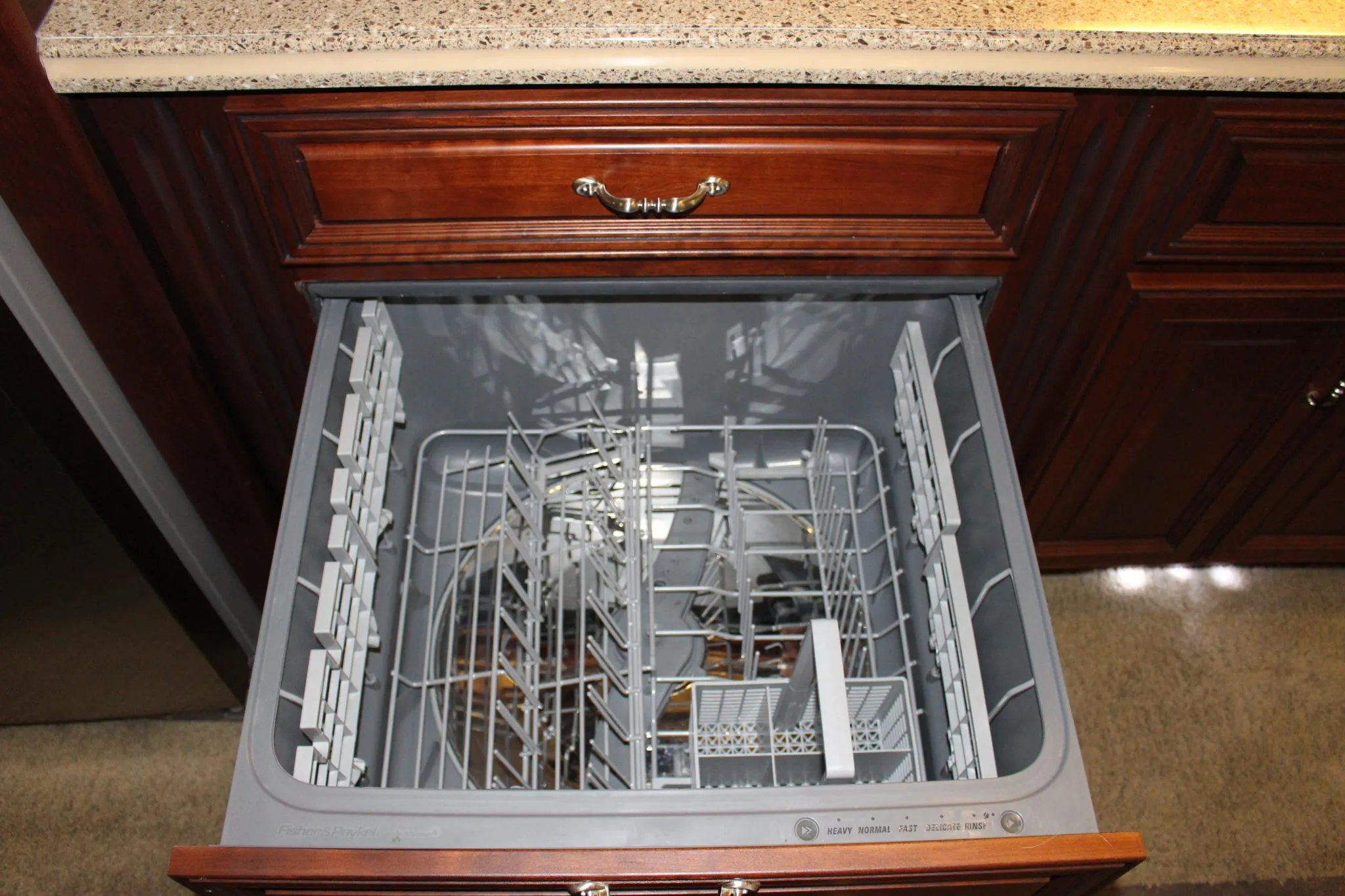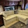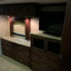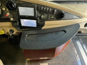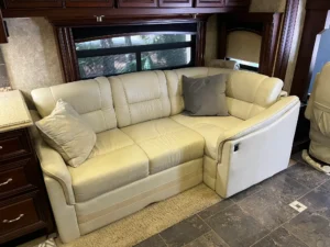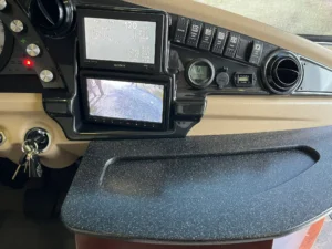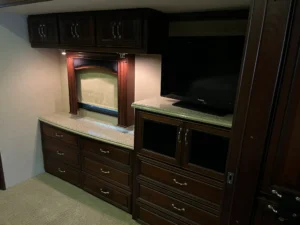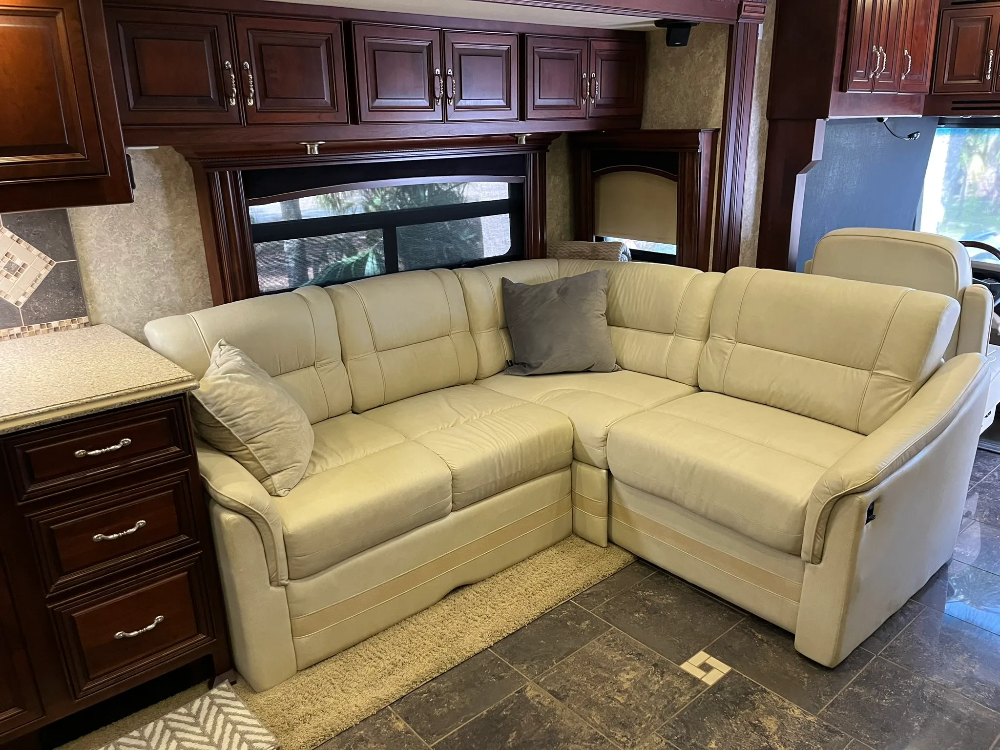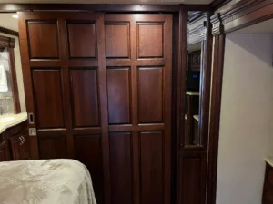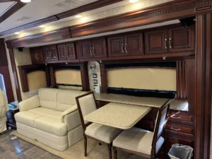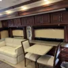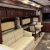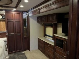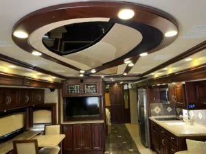 Step inside the 45T and experience a beautifully finished cabin with an 84-inch ceiling height, heated tile flooring, and handcrafted cherry wood cabinetry. The layout combines open living comfort with practical luxury for long-term touring.