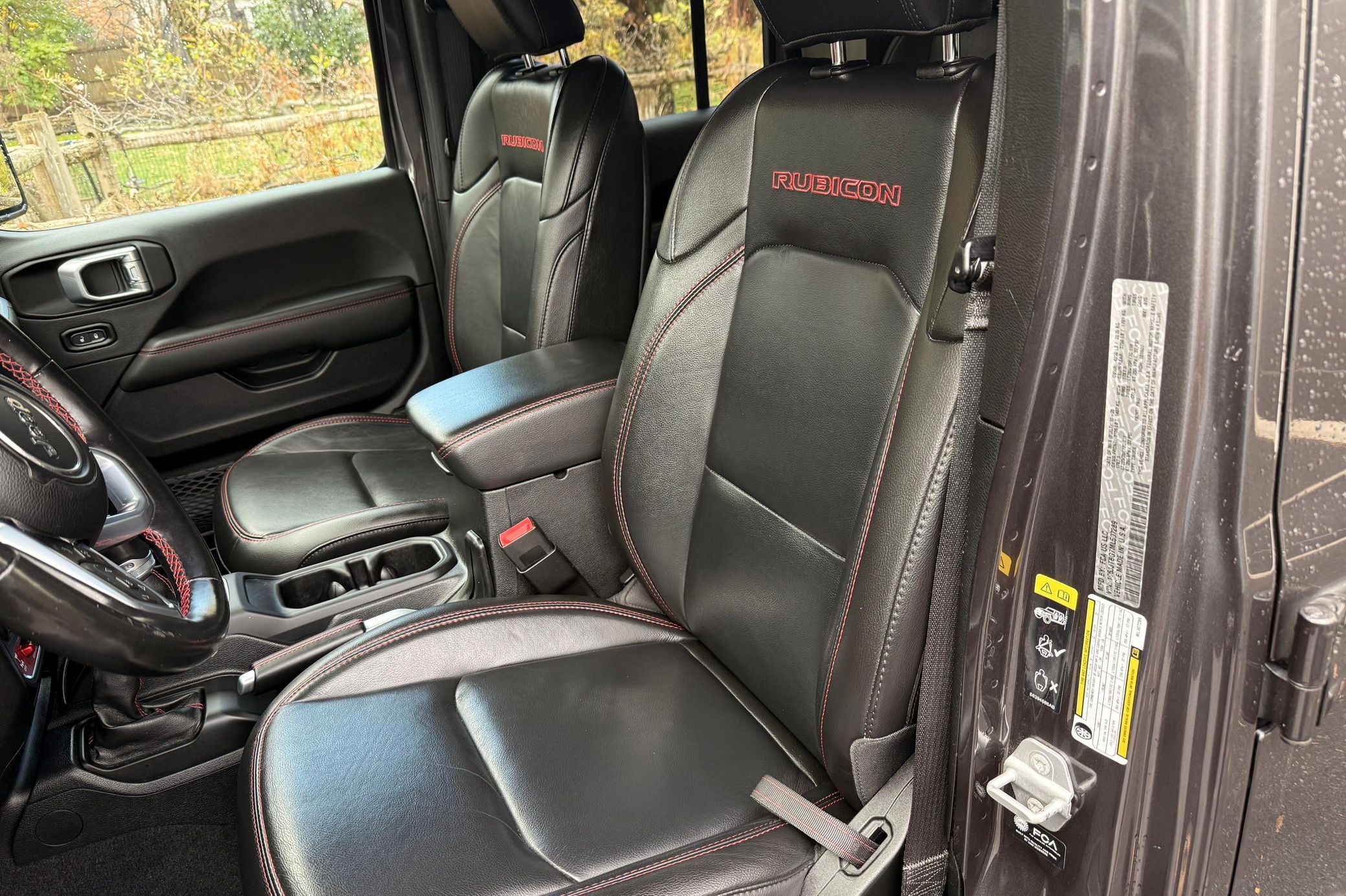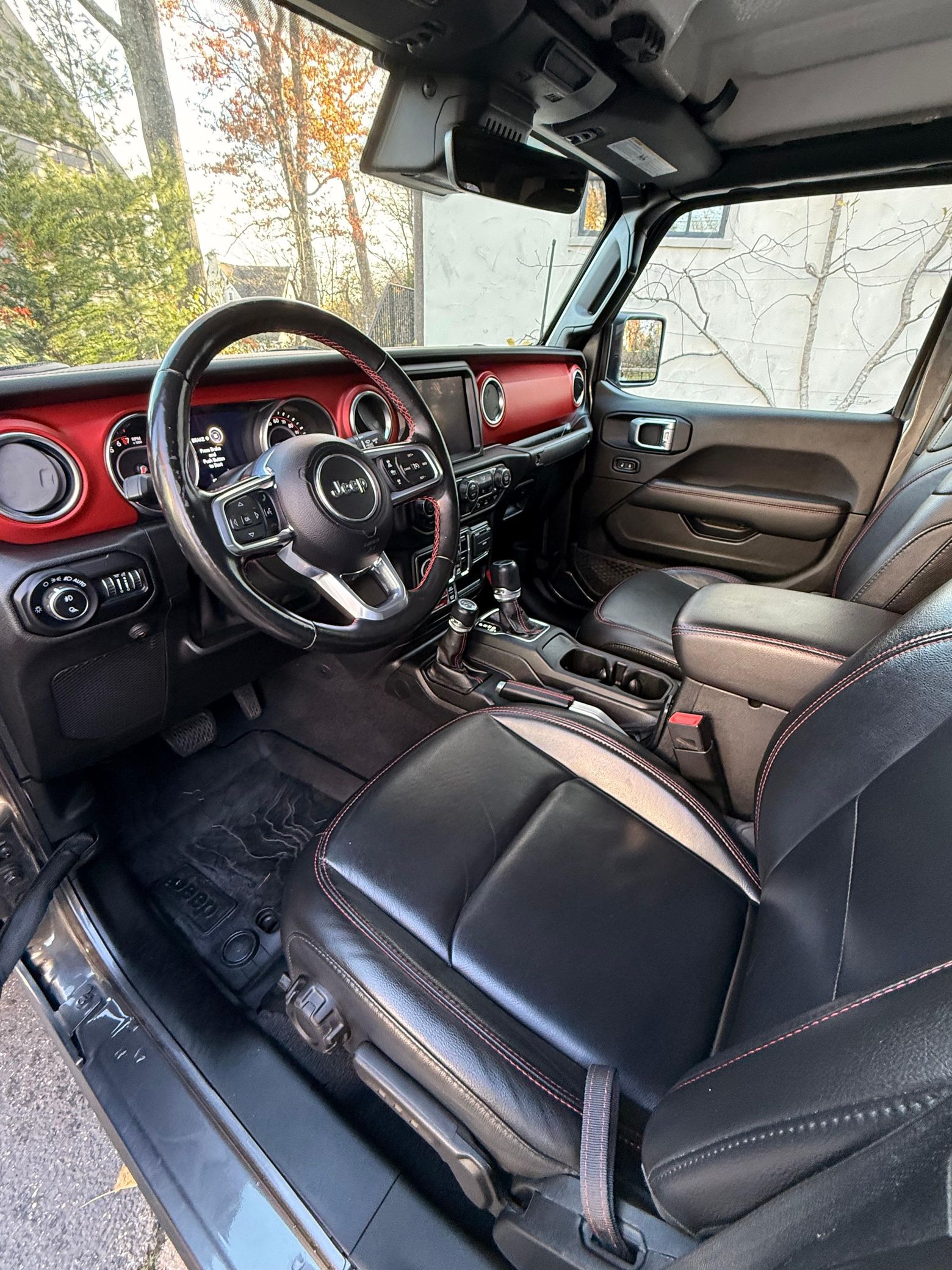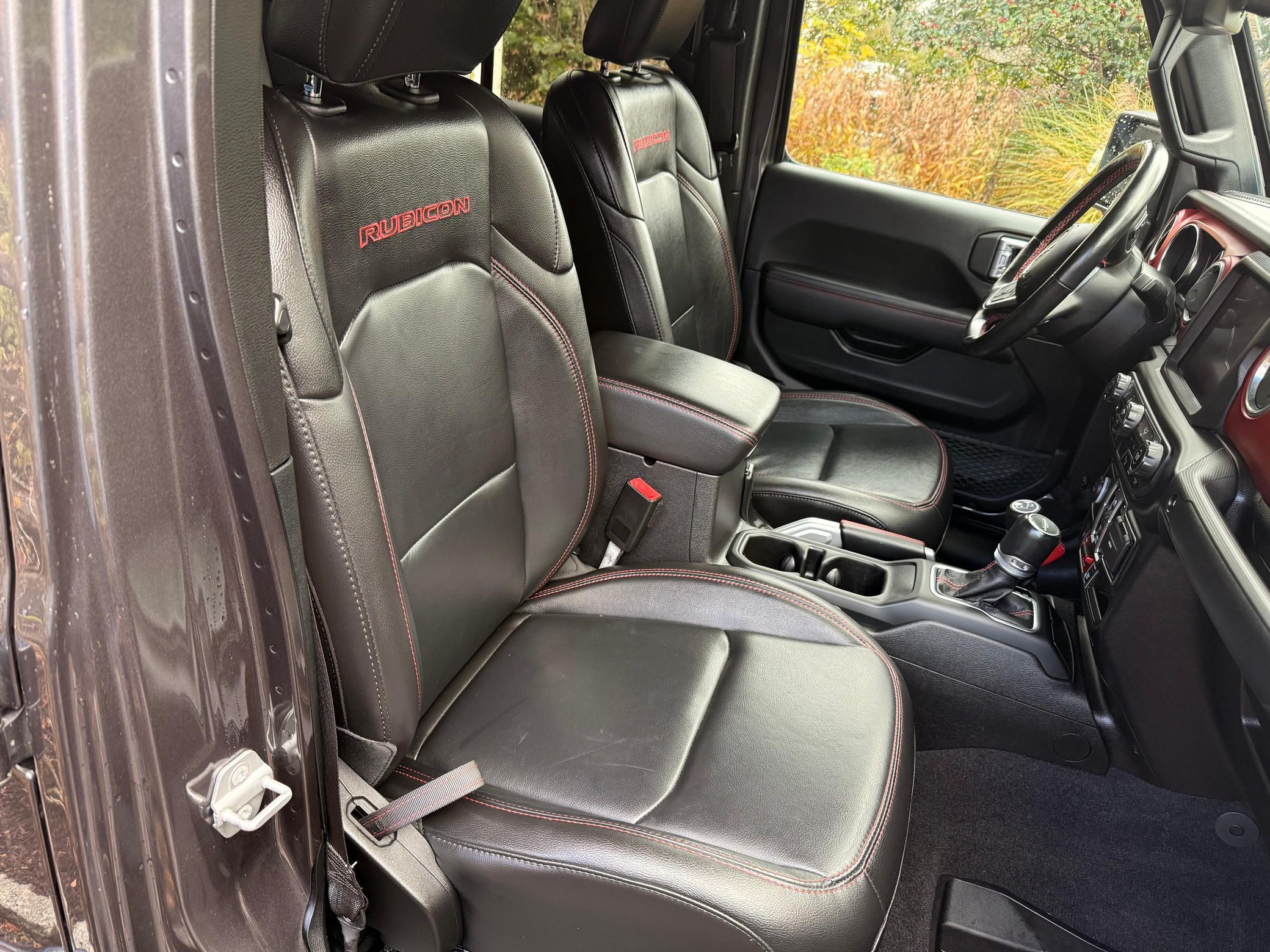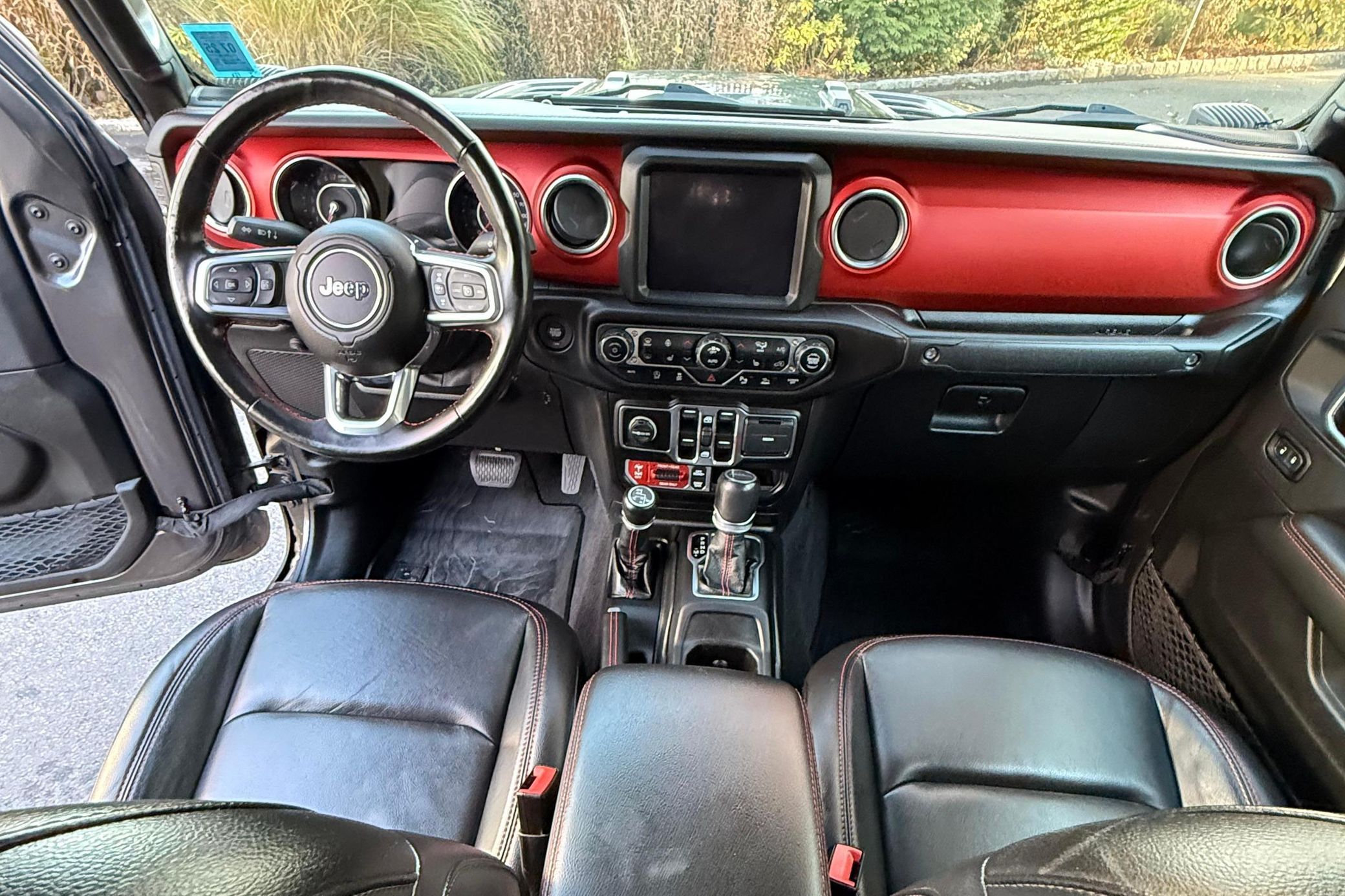 2021 Jeep Gladiator Rubicon 4×4, finished in Granite Crystal Metallic with a black interior. The included Carfax history report lists no accidents or mileage discrepancies.